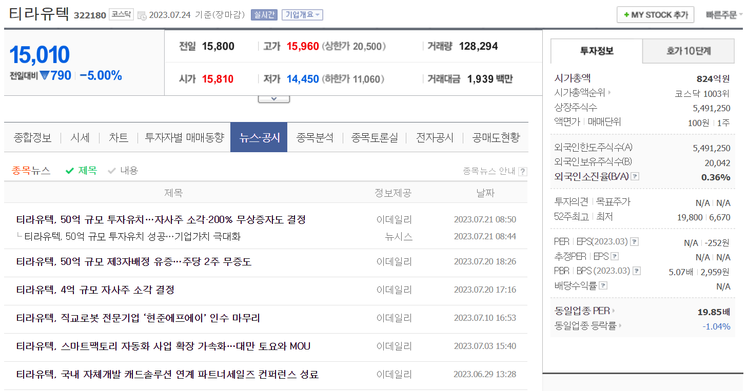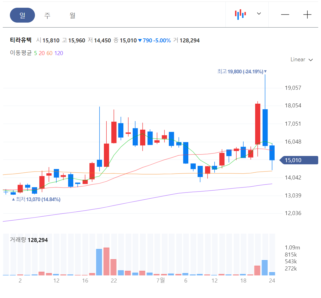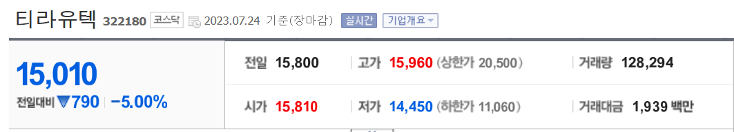 오늘 증시에서도 티라유텍은 시가 대비 -5% 하락한 15,010원으로 장을 마감했습니다.