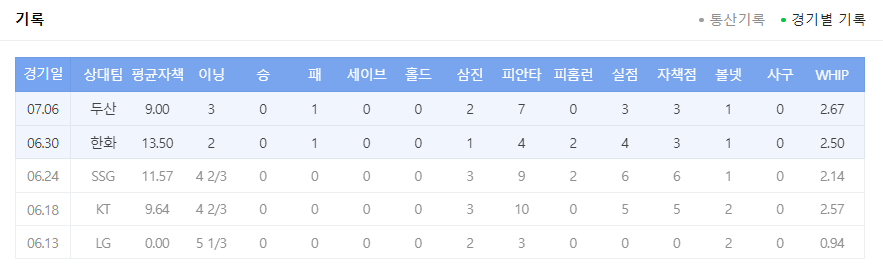 반면 리그 최하위를 달리고 있는 삼성은 최채흥을 선발로 내세웁니다. 최채흥은 올 시즌 19 2/3이닝을 던지며 0승 2패 평균 자책점 7.78을 기록하며 군 제대 이후 굉장히 불안정한 피칭을 보여주고 있습니다. 선발 로테이션의 한 자리는 지켜주고 있지만 이닝별 실점 위기마다 실점하며 긴 이닝을 소화하지 못하고 마운드에서 내려가는 모습입니다.
