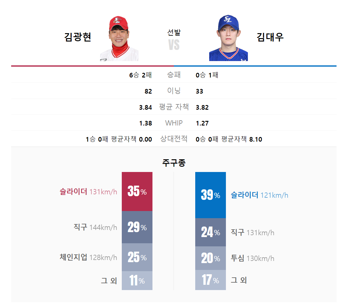 사이좋게 1승 1패씩 주고 받은 가운데, 위닝 시리즈를 위해 홈팀 삼성 라이온즈는 '언더스로우' 김대우 선수가 선발등판 예정입니다. 원정팀 SSG 랜더스는 '국내 좌완 에이스' 김광현 선수의 선발등판을 예고했습니다.