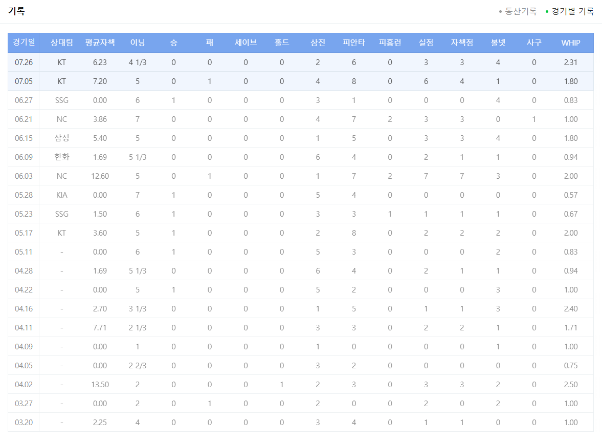 먼저 키움 히어로즈의 선발투수 이안 맥키니 선수는 올 시즌 27이닝을 소화하는 동안 1승 3패 평균 자책점 3.33을 마크하고 있습니다. '대만판 요키시'인 맥키니 선수의 경기별 기록을 보면 들쭉날쭉한 피칭을 보여주고 있기 때문에 현재 기록으로만 보았을 때는 요키시 선수가 그리울 수 밖에 없는 키움 히어로즈 입니다.