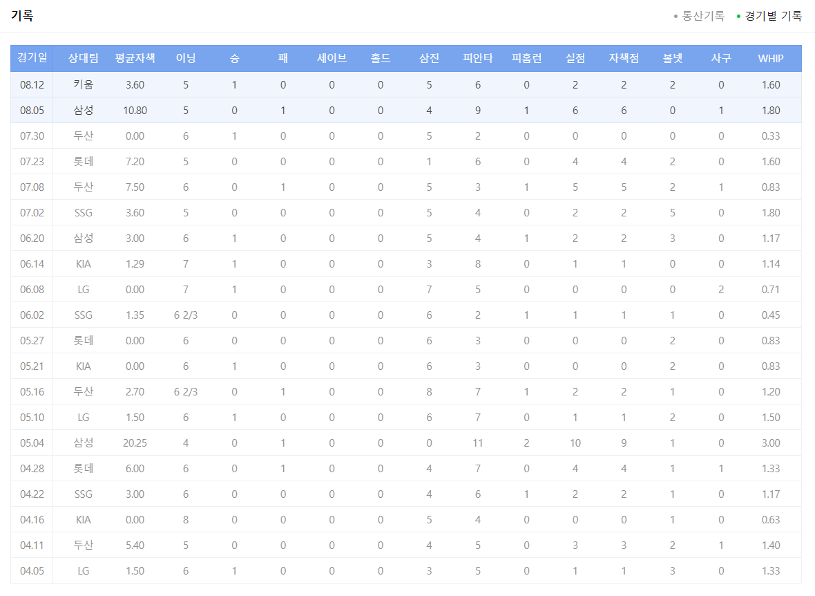 먼저 LG 트윈스의 '우승을 위한 마지막 퍼즐'인 최원태 선수입니다. 최원태는 올 시즌 118 1/3이닝을 소화하는 동안 8승 5패 평균 자책점 3.42를 기록하고 있습니다. 키움 히어로즈에서 '우승을 위한 선발'로 미래 전력 3명을 내어주고 데려온 최원태는 생각보다 LG 트윈스에 잘 정착하는 모습을 보여주고 있습니다. 경기별 기록을 살펴보면 트레이드 이후 최근 3경기에서 2승 1패를 기록하고 있고 키움 시절과는 다르게 팀 타선의 득점 지원도 특급으로 받고 있기 때문에 최원태와 LG 트윈스 팀 전체가 시너지 효과를 내고 있는 모습입니다.